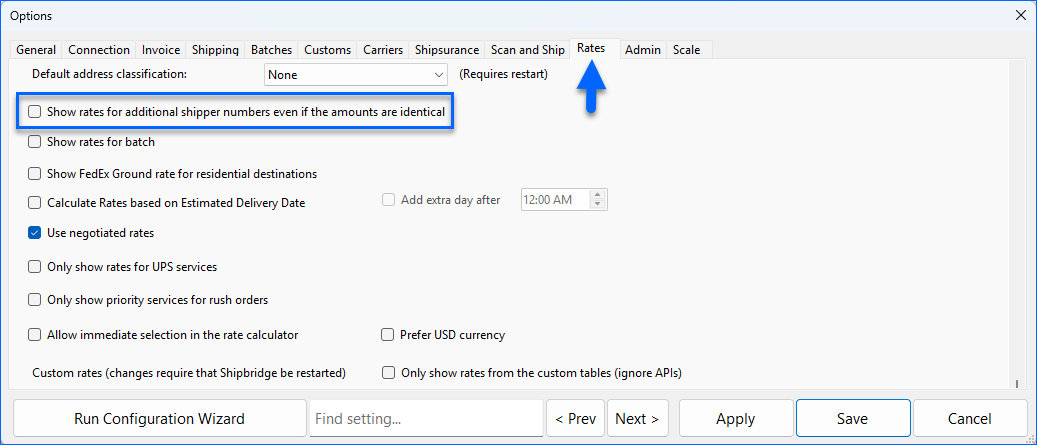 We have added a new setting in the Rates Tab of the Shipbridge options: Show rates for additional shipper numbers even if the amounts are identical. By default, the Rates Calculator only displays the UPS Additional Shipper Numbers if the calculated rates are distinct. Enable this setting to ensure all rates are shown, even if they are for the same amount.