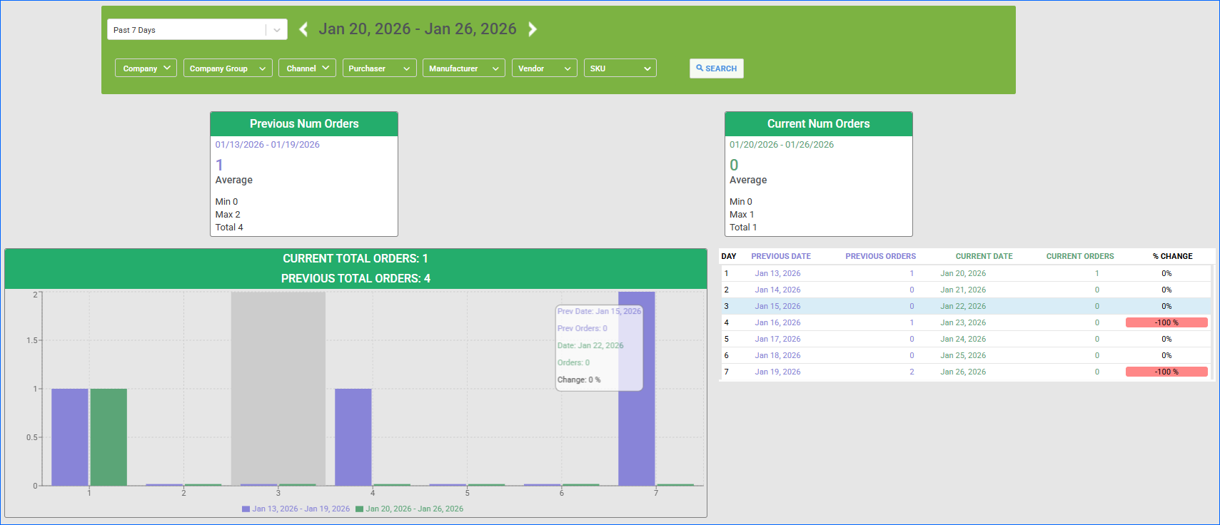 We have added a Number of Order Comparison page to the Profit and Loss Dashboard. Here, you can view details about the daily number of orders and compare them to similar date ranges.