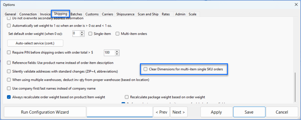 We have added a new Shipping Option to Shipbridge: Clear Dimensions for multi-item single SKU orders. When enabled, we will not autopopulate the dimensions of orders that contain multiple units of the same SKU.