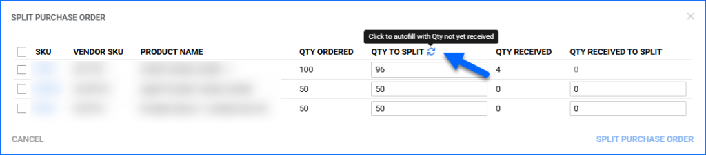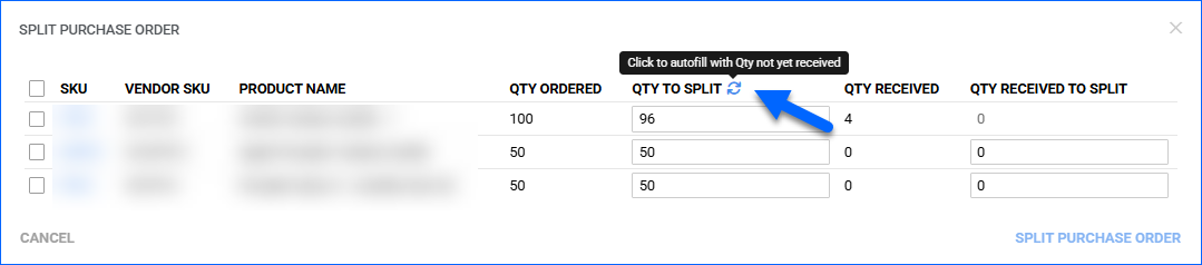 We have added a new button on the Split Purchase Order pop-up modal, which allows you to automatically recalculate the Qty To Split based on the quantity that has not been received yet.