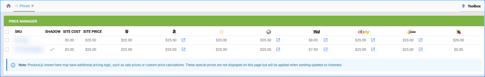 We have updated the Prices Tab of the Product Details page toolbox. We have removed deprecated channels and added a note clarifying that additional pricing logic is not displayed on the page, but will still be applied when revising listings.