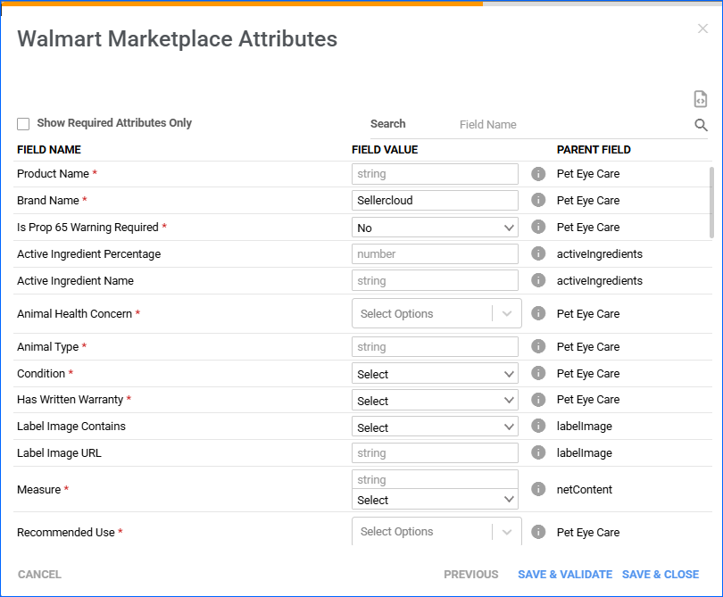 We have updated the Walmart Marketplace Product Attributes modal on the Product Details page. We removed elements that were no longer needed and added the Save & Validate button.